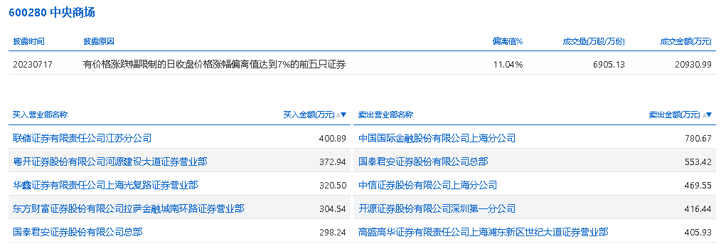 7月17日,中央商场今日涨停,龙虎榜数据显示,上榜营业部席位全天成交4323.11万元,占当日总成交金额比例为20.65%。其中,买入金额为1697.1万元,卖出金额为2626.01万元,合计净卖出928.91万元。