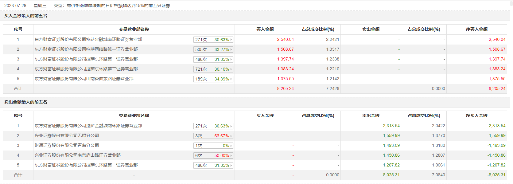 具体来看,东方财富证券拉萨金融城南环路证券营业部、东方财富证券拉萨团结路第一证券营业部分别买入2540.04万元、1508.67万元;东方财富证券拉萨金融城南环路证券营业部、兴业证券无锡分公司分别卖出2313.54万元、1559.99万元。