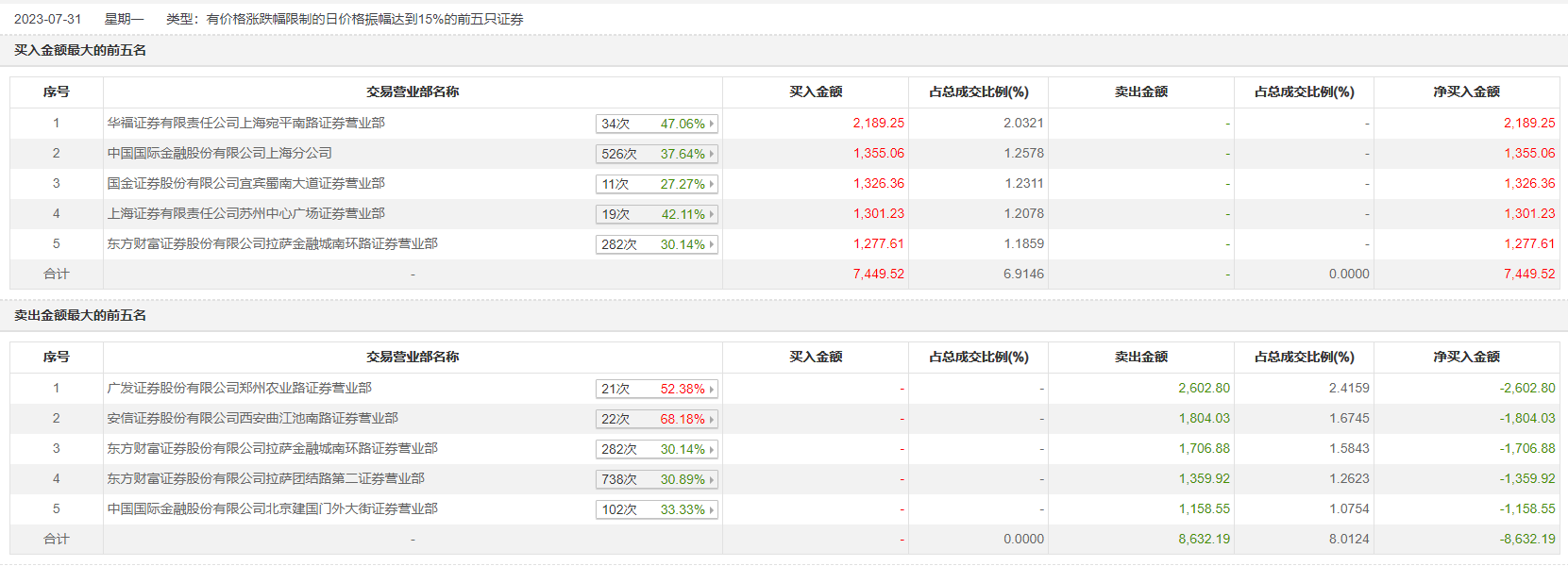 具体来看,华福证券上海宛平南路证券营业部、中国国际金融上海分公司分别买入2189.25万元、1355.06万元;广发证券郑州农业路证券营业部、安信证券西安曲江池南路证券营业部分别卖出2602.80万元、1804.03万元。