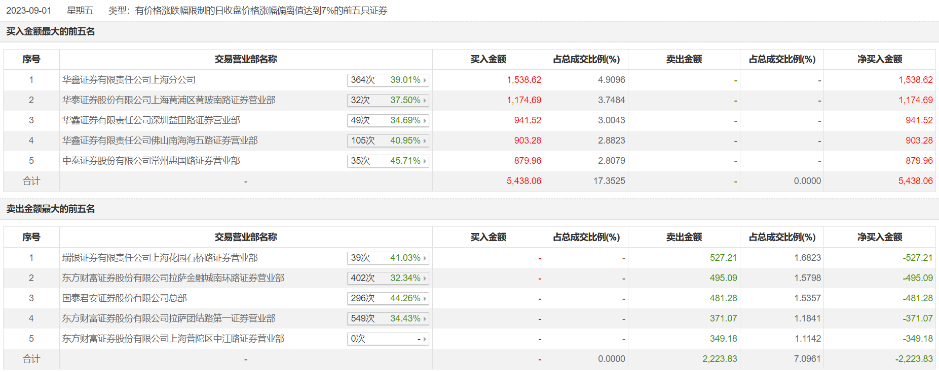 具体来看,华鑫证券上海分公司、华泰证券上海黄浦区黄陂南路证券营业部分别买入1538.62万元、1174.69万元;瑞银证券上海花园石桥路证券营业部、东方财富证券拉萨金融城南环路证券营业部分别卖出527.21万元、495.09万元。