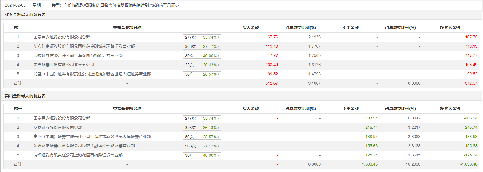 2月5日,中央商场今日跌停,龙虎榜数据显示,上榜营业部席位全天成交1703.15万元,占当日总成交金额比例为25.32%。其中,买入金额为612.67万元,卖出金额为1090.48万元,合计净卖出477.81万元。