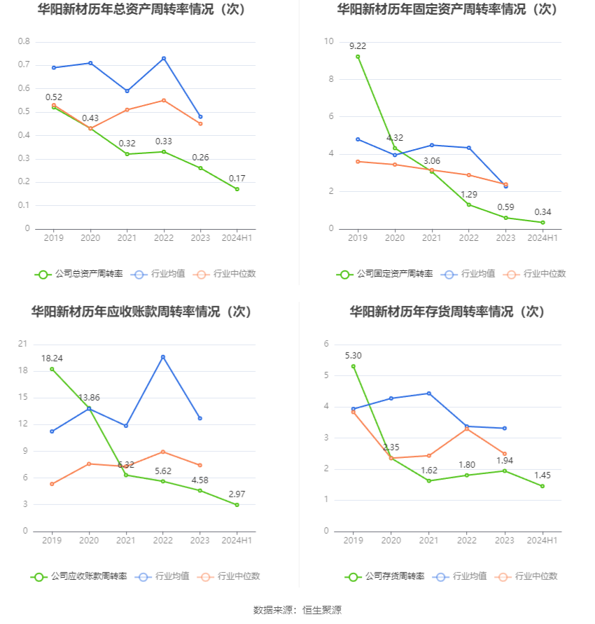 营运能力方面,2024年上半年,公司公司总资产周转率为0.17次,上年同期为0.18次(2023年上半年行业平均值为0.24次,公司位居同行业11/14);固定资产周转率为0.34次,上年同期为0.47次(2023年上半年行业平均值为1.30次,公司位居同行业13/14);公司应收账款周转率、存货周转率分别为2.97次、1.45次。