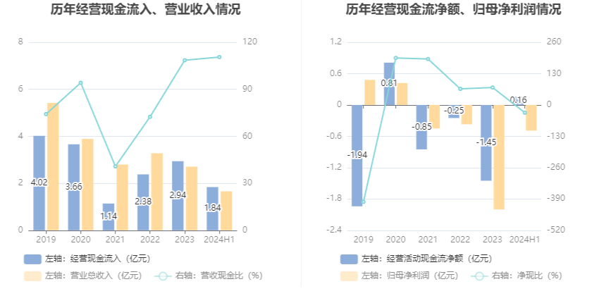 2024年上半年,公司营业收入现金比为110.57%,净现比为-32.05%。