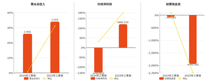 公司营业总收入为3.26亿元,较去年同报告期营业总收入增加7724.55万元,实现2年连续上涨,同比较去年同期上涨31.10%。归母净利润为6888.33万元,较去年同报告期归母净利润增加1.57亿元,实现2年连续上涨。经营活动现金净流入为-9443.78万元。