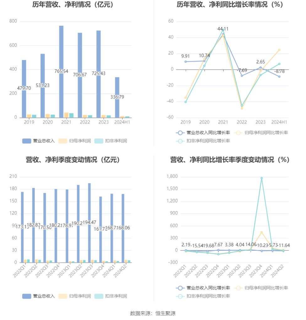 根据半年报,公司第二季度实现营业总收入168.06亿元,同比下降11.64%,环比下降0.39%;归母净利润6.79亿元,同比增长10.85%,环比增长22.65%;扣非净利润5.89亿元,同比下降6.16%,环比增长37.94%。