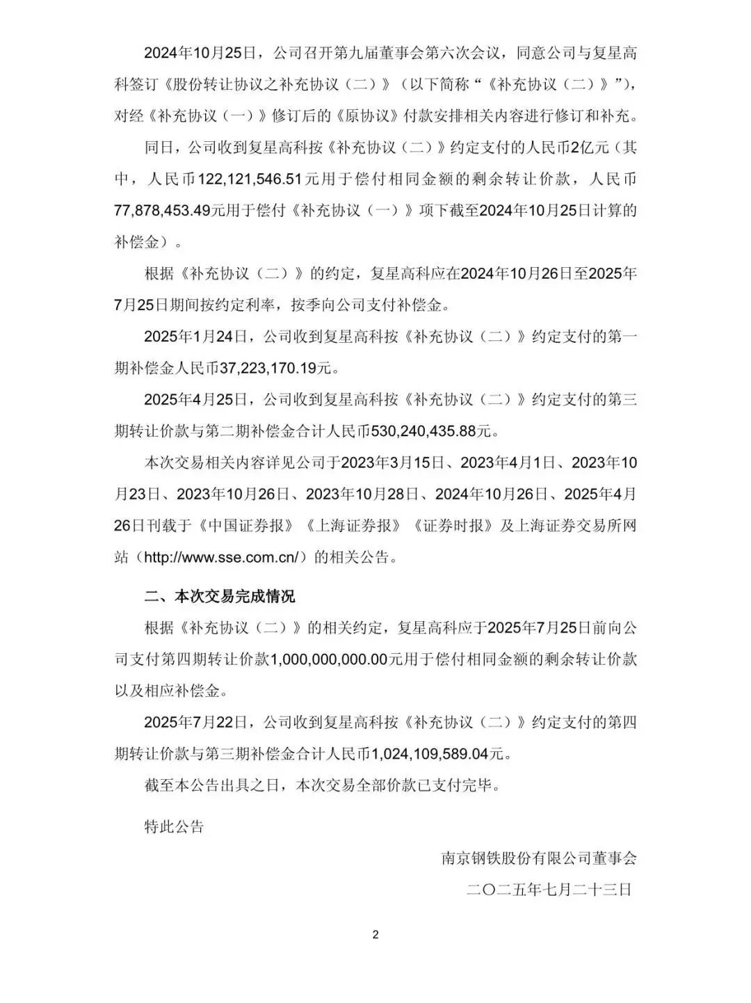 截至2025年7月22日,复星高科支付完毕全部款项,包括第四期转让价款10亿元及第三期补偿金2410.96万元。
