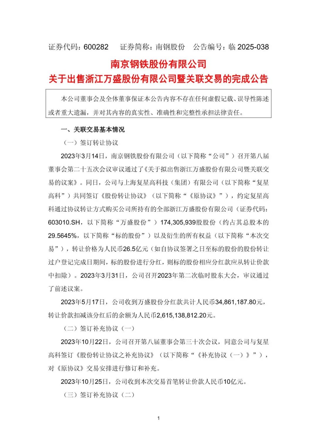 2025年7月23日,南钢股份(600282)发布公告,宣布出售浙江万盛股份相关交易完成。