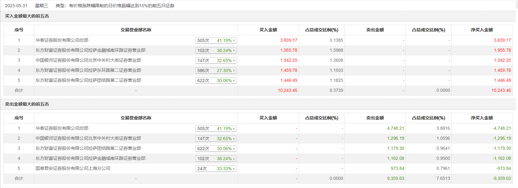 具体来看,华泰证券总部、中国银河证券北京中关村大街证券营业部分别卖出4748.21万元、1296.19万元;华泰证券总部、东方财富证券拉萨金融城南环路证券营业部分别买入3839.17万元、1955.78万元。