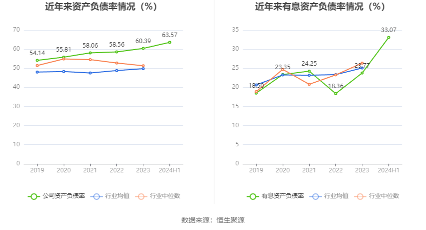在偿债能力方面,公司2024年上半年末资产负债率为63.57%,相比上年末上升3.18个百分点;有息资产负债率为33.07%,相比上年末上升9.30个百分点。