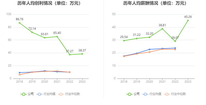 截至2023年末,公司员工总数为1504人,人均创收1178.57万元,人均创利38.37万元,人均薪酬45.26万元,较上年同期分别增长18.74%、2.94%、55.70%。