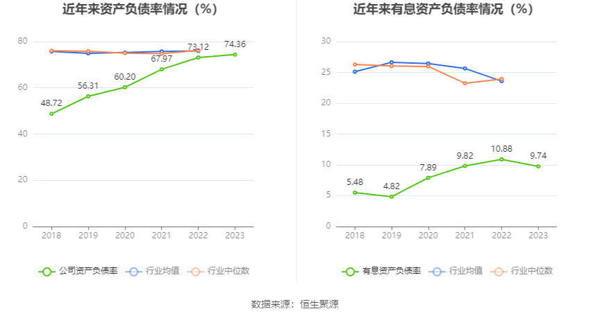 在偿债能力方面,公司2023年年末资产负债率为74.36%,相比上年末上升1.24个百分点;有息资产负债率为9.74%,相比上年末下降1.14个百分点。