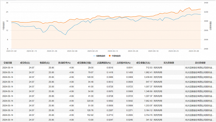 5月14日大宗交易成交1086.75万股,成交额2.67亿元,占当日总成交额的56.35%,成交价24.57元,较市场收盘价25.86元折价4.99%。