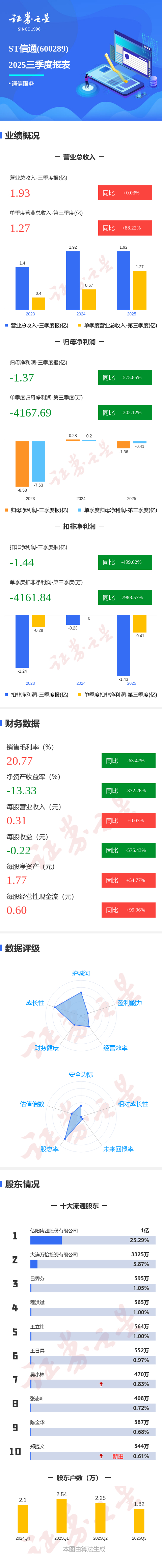 图解ST信通三季报:第三季度单季净利润同比下降302.12%
