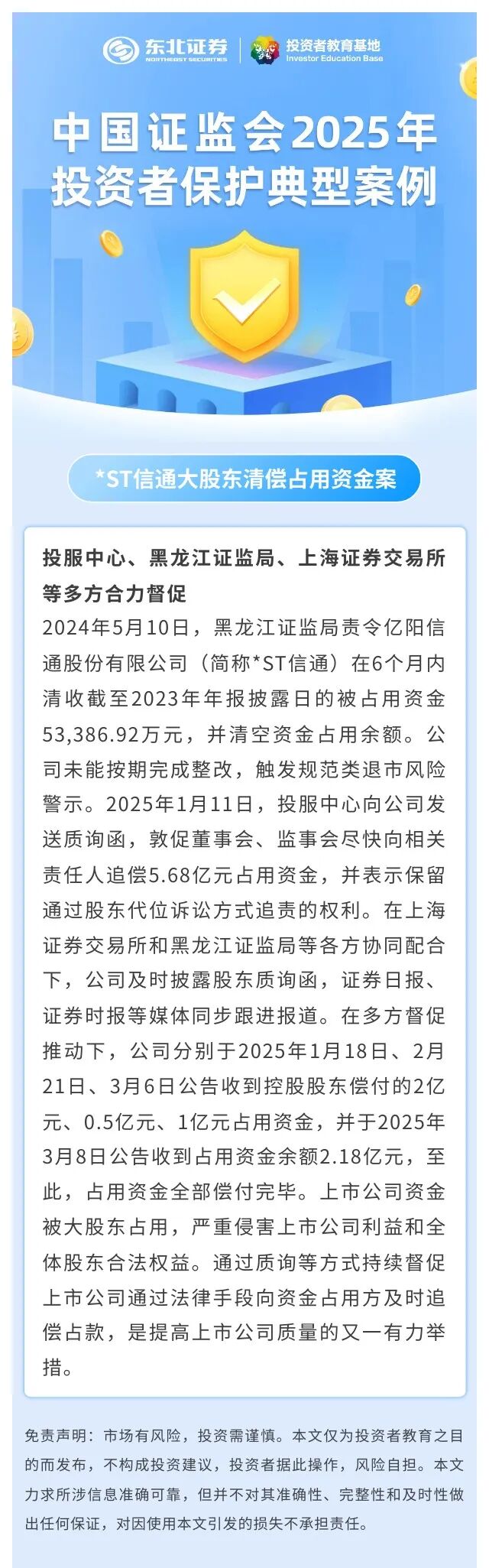 【理性投资】中国证监会2025年投资者保护典型案例:*ST信通大股东清偿占用资金案
