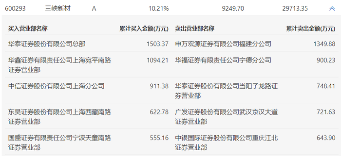 三峡新材今日涨停,龙虎榜数据显示,上榜营业部席位全天成交9050.95万元,占当日总成交金额比例为30.46%。其中,买入金额为4686.89万元,卖出金额为4364.06万元,合计净买入322.83万元。