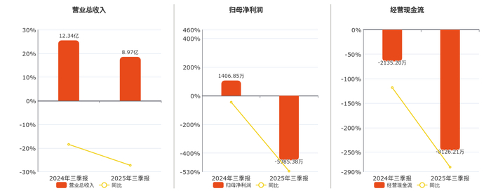 公司营业总收入为8.97亿元,较去年同报告期营业总收入减少3.37亿元,同比较去年同期下降27.29%。归母净利润为-5985.38万元,较去年同报告期归母净利润减少7392.23万元,同比较去年同期下降525.45%。经营活动现金净流入为-8126.21万元,较去年同报告期经营活动现金净流入减少5991.01万元。