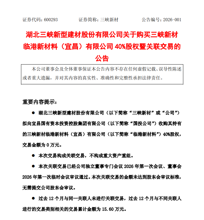 1月5日,三峡新材(600293.SH)公告称,公司拟向宜昌国有资本投资控股集团有限公司(简称“宜昌国投”)收购其持有的三峡新材临港新材料(宜昌)有限公司(简称“临港新材料”)40%股权,交易金额为0元。本次交易构成关联交易,不构成重大资产重组。公司已召开独立董事专门会议和董事会审议通过该交易,无需提交股东会审议。过去12个月,公司与同一关联人未进行关联交易,与不同关联人进行的交易累计金额为15.60万元。
