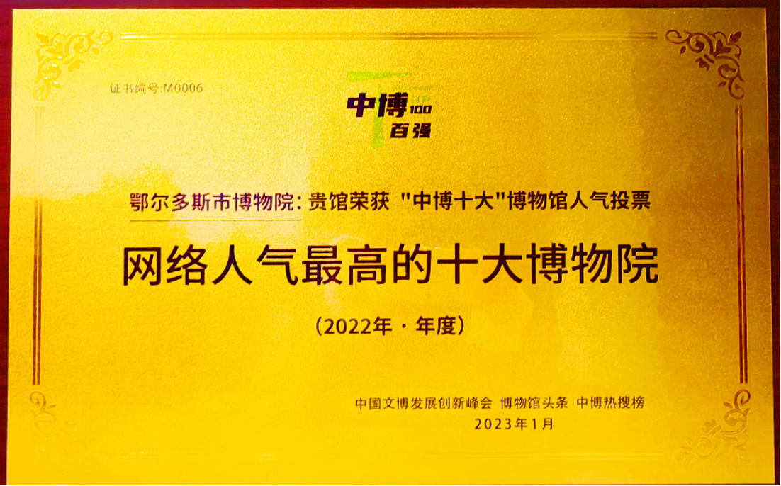 为全面展示全国各大博物馆的网络人气情况,中国文博发展创新峰会2022年11月份推出「十大特色博物馆专题推介活动」,共计涉及约一百三十家博物馆参与展示,鄂尔多斯市博物院在此次活动中荣获全国网络人气最高十大博物院之一。
