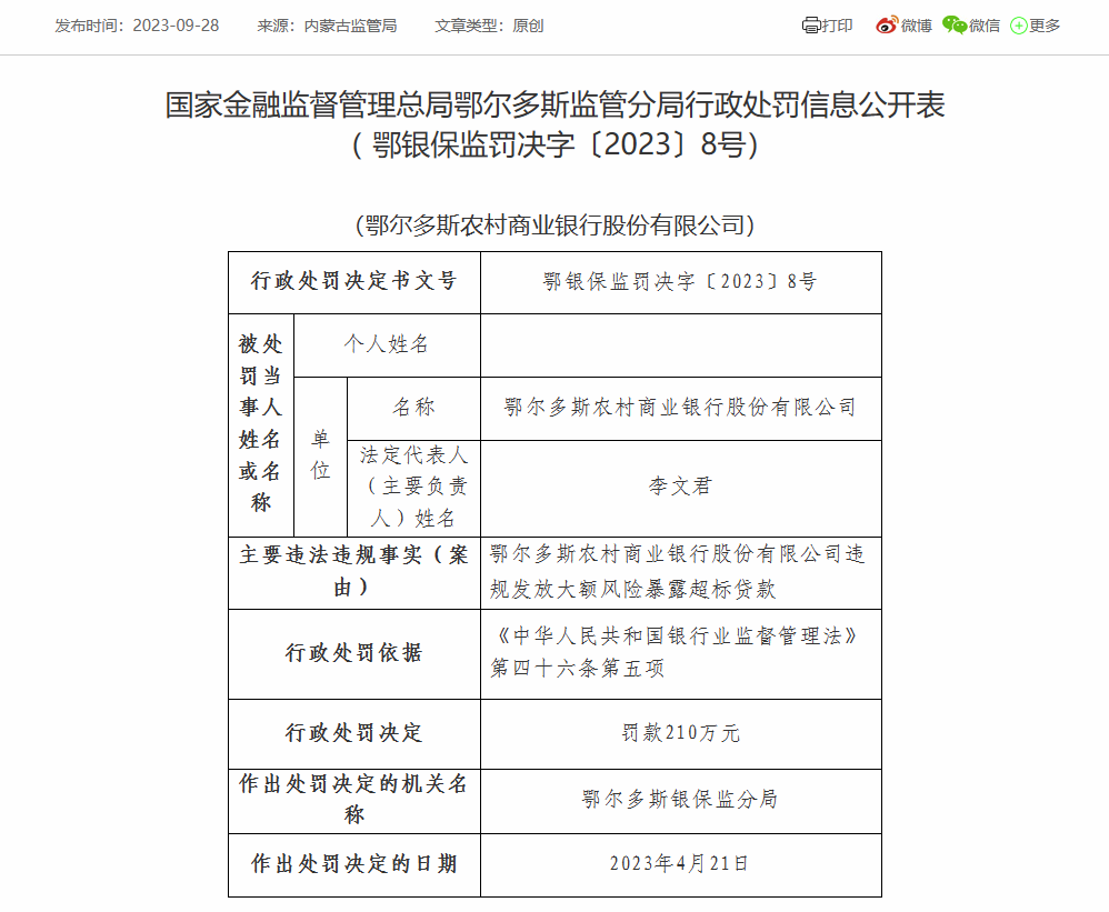 鄂尔多斯农商银行被罚210万:因违规发放大额风险暴露超标贷款