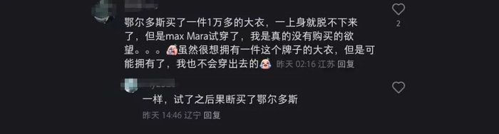 图源:网友评论社交媒体上关于“Max Mara中国定价是欧洲两倍以上”的争议,更是加速了这一进程,消费者开始追问:为品牌支付的额外部分,究竟买到了什么不可替代的价值?