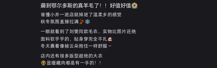 图源:小红书这带来的核心优势是极致的成本控制与品质确定性,当Loro Piana或Brunello Cucinelli需要为物流和关税支付额外成本时,鄂尔多斯却能将更多资源投入于原料升级、工艺研发和品牌建设。
