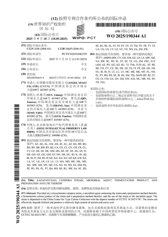 安琪酵母公布国际专利申请:“单孢哈萨克斯坦酵母菌株、菌剂、发酵物及其制备和应用”