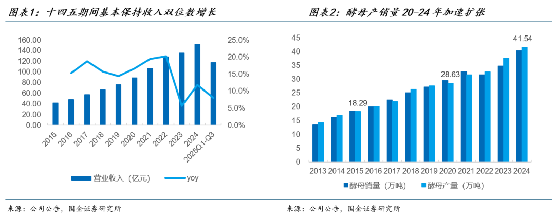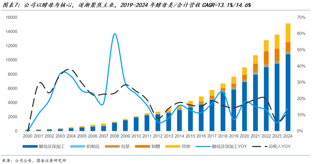 主业根基持续巩固,多元布局协同增效。从收入拆分来看,1)酵母及深加工为核心业务,收入规模超百亿元,占比70%以上,其下细分出多项衍生业务,如动植物营养、YE等。2)包装业务是 2009 年收购宏裕塑业(2015 年更名宏裕包材)后的并表业务,销售体量4个亿,占比稳定在 2%- 3%,已于2023年在北交所上市。3)制糖业务销售占比约 8%,是主要原材料糖蜜的上游延伸产业,销售额约12个亿,近年来公司逐步剥离其中贸易糖业务,改善盈利能力。4)其他业务含14个亿的食品原料业务,以及12个亿贸易类及其他业务,近年来复合增速20%+。5)奶制品业务已于2022年3月逐步剥离。
