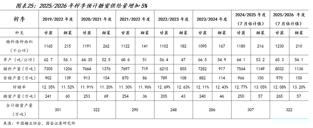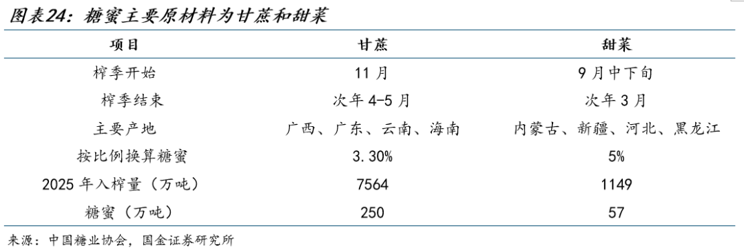 从供给端来看,糖蜜主要原材料是甘蔗和甜菜,二者分别产自南方和北方,榨季和产出比存在较大差异。一般,甜菜榨季较早(9月开榨),甘蔗较晚(11月开榨)。甜菜产出比更高(5%),甘蔗产出比较低(3.3%)但种植面积较广。以2024年入榨量来看,甘蔗糖蜜占比高达85%。根据中国糖业协会数据公布的糖料产量,我们估算得到2025/2026榨季糖蜜总产量为322万吨,同比增长约5%。