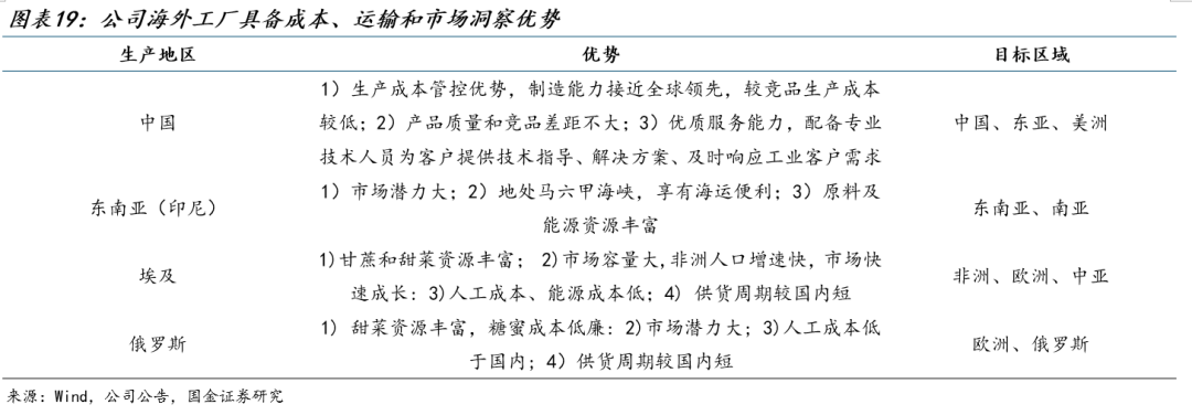 2)倾斜海外产能增长:公司新设印尼分公司预计于2027年建成投产,海外产能进一步增加。同时,埃及所处的北非地区与印尼分别为甜菜与甘蔗的主要种植区域,糖蜜产量丰富,成本低廉。此外,印尼、北非等地人工费用、海运费、税费等与国内相比均较低,能够有效降低成本,从而使得产能大幅提升。