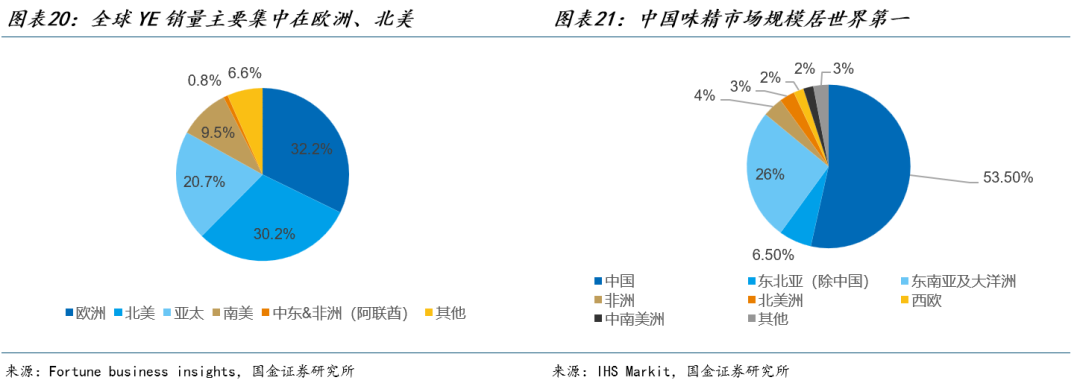 随着大众减盐健康意识提升,预计未来YE对味精替代率提升。结合饮食习惯、产业链配套等因素,目前主流消费区域仍集中在欧洲和北美,二者YE消费量超过全球60%。相比之下,我国是味精产销量最大的国家,市场规模全球占比超过50%,但YE销量占比不到20%,预计未来仍有较大的替代空间。