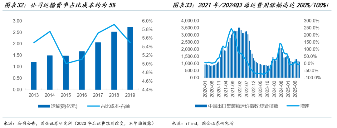 由于海外市场需求旺盛,公司出口占比逐年提升,加上公司以CIF为主要结算模式,海运费用成为一项重要成本。平常年份海运费用约2-2.5亿元,2021年提升至4-4.5亿元,运输成本翻倍增长。2022上半年海运费用继续高涨,涨幅超50%。但进入2022年9月后,CCFI综合指数回落,基本恢复到2020年涨价前位置。