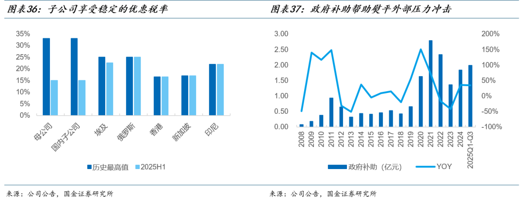 税率:从上市至今,母公司及各子公司企业所得税率大部分呈下降趋势,并在2017年后基本稳定在历史低位。其中国内主体和各子公司大多享受由高新技术、西部大开发、小微企业认定的优惠税率(15%、20%)。国外的埃及公司在成立两年后,下调税率2.5%;俄罗斯公司于2025H1上调税率9.5%。从长远角度看,公司致力于“全球第一酵母企业,国际一流生物技术公司”的战略目标,构建了了以多位享受国务院、省级政府津贴专家为主的创新技术团队,主导或参与制定了酵母及酵母衍生品的全部国家标准及行业标准,连续多年被工信部评为“国家技术创新示范企业”,享受为期3年的税收优惠政策。