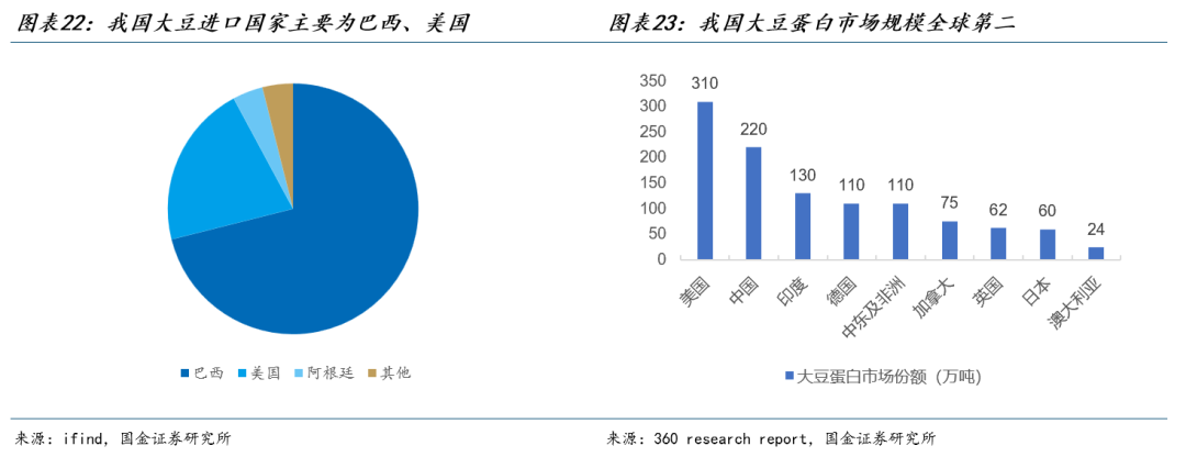 酵母蛋白未来市场增量:1)我国优质蛋白自给率不足60%,对大豆进口依存度长期超80%,2024年进口量达1.05亿吨,其中美国大豆占比约 20%。关税战导致进口大豆成本显著上升。2)目前的研究表明,微生物蛋白的碳排放量仅为同单位肉制品蛋白碳排放量的2%~10%,土地暂用量更是仅为肉产品生产的0.5%~1.5%。据测算,如果到2050年用真菌蛋白替代全球20%的牛肉消费,能够减少每年56%的森林砍伐和相关二氧化碳排放。因此其在降低碳排放、节约耕地和淡水资源上具有显著优势,是绿色、安全、高效的蛋白,更符合当前我国提出的碳中和战略发展要求。