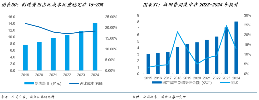 折旧较多的年份,制造费用占比相应提升,显著影响毛利率。从公司十二五-现今十四五期间的产能、折旧以及毛利率等分析来看,固定资产折旧金额基本和毛利率呈现反向变动关系。公司固定资产折旧从2021年的5.23亿元大幅飙升至2024年的8.06亿元,与公司近五年大幅扩产相符合,毛利率在2021-2024年下降约4pct。