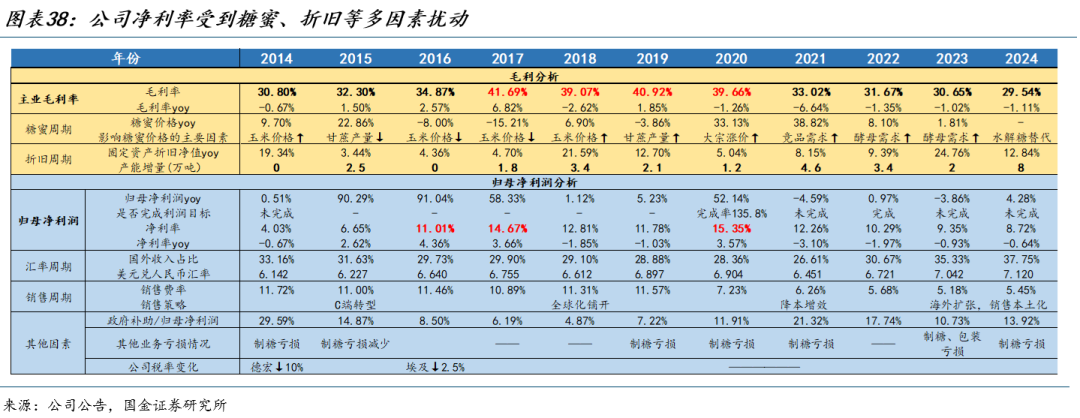 2020-2024年(收入持续高增,利润显著下滑)1)随着公司对于海内外多项产品提价以对冲成本压力,吨价显著提升。销量也随着产能释放同步增长,因此公司收入维持双位数增长。2)糖蜜价格高涨+折旧费用提升+海运费激增+人民币汇率升值。多重因子重压下, 21年毛利率下降6.6pct,净利率下降3.1pct。22-23年毛利率逐年持续下降至30.65%,净利率持续下降至8.7%。