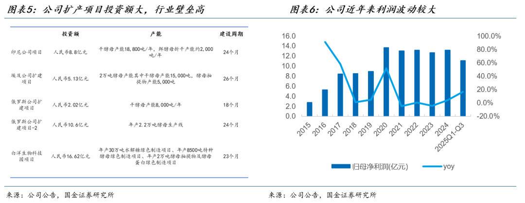 酵母行业具备较强的进入壁垒,重资产投入+利润波动大,阻碍中小竞争对手扩张。酵母行业在产能建设、研发储备等方面需要投入大量资金,且投资回报期较长,以印尼项目为例,建设2万吨产能需要投入8.8亿元,且面临当地土地、环保等协商审核问题,产能建设周期较长。另外行业利润受成本、折旧等影响波动较为剧烈,以公司为例,2020-2024年净利率从15.35%下降至8.72%,部分年份甚至净利润下滑。