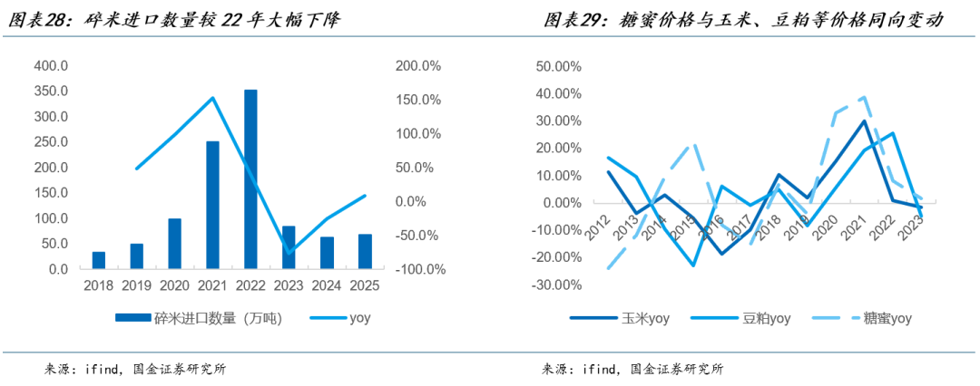 另外,从需求端来看,糖蜜主要应用于酒精、酵母、饲料等行业,在糖蜜价格大幅上涨的情况下,酒精企业更倾向于寻求成本更低的木薯和玉米作为酿造原料。饲料行业也多采用豆粕等原材料进行替代,因此糖蜜价格与替代品(各类粮食作物)的价格形成较强的联动关系。当玉米、豆粕等主要饲料原料价格走低时,糖蜜的性价比优势减弱,会被大量替代。因此,从2022年开始,玉米、豆粕以及糖蜜价格出现同向变动趋势。