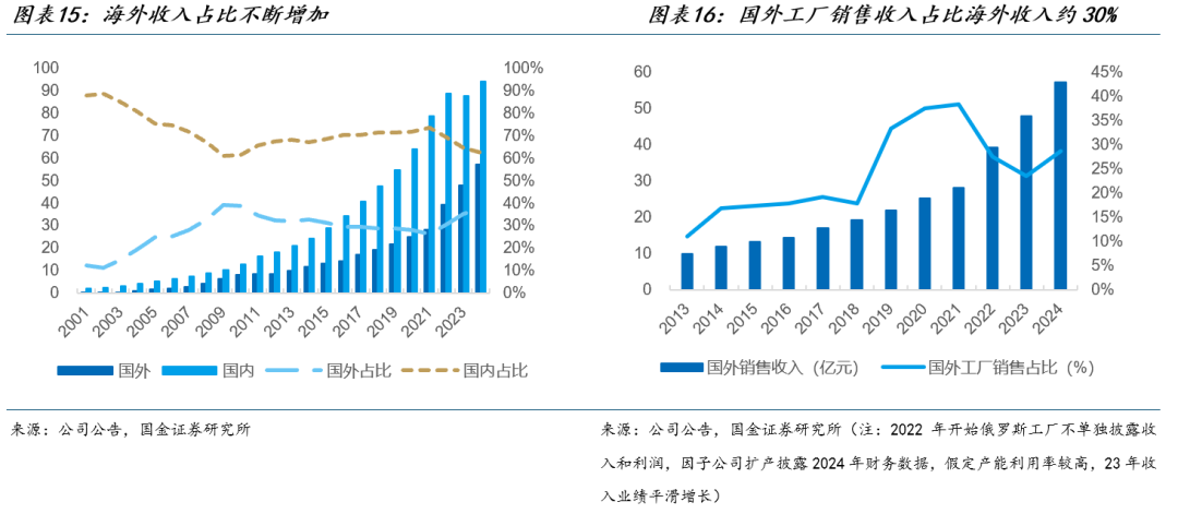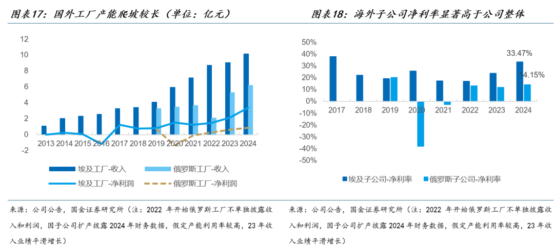 由于跨国建厂受制于环保、土地等政策因素,国外工厂产能爬坡期较长,且部分年份存在汇率风险,前期以亏损为主。以埃及工厂为例,前期投入较大、产能爬坡周期厂,2017年实现稳定盈利。随着埃及分公司发展逐渐稳定,分公司实现了原料本地化采购,近五年盈利不断增加,2024年净利率与2021年相比提升6pct,同时显著高于国内利润率水平。而俄罗斯工厂受益于汇率因素,2022年上半年首次扭亏为盈,2024年利润率超14%。印尼工厂于2025年开始建设,预计工期24个月,将于2027年建成投产。