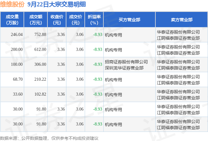 9月22日维维股份现7笔大宗交易 机构净买入1861.52万元