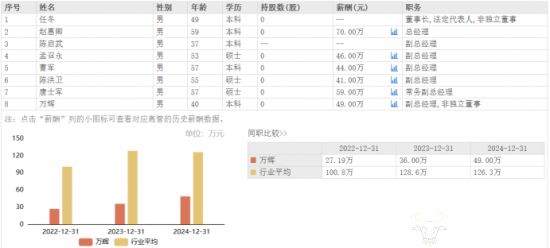 去年,该公司高管薪酬纷纷上涨。万辉2024年薪酬为49万元,相较于2023年的36万元,增长了13万元,为五位副总经理中涨薪最多的,也是副总经理中的最高薪酬,但仍低于常务副总经理唐士军。唐士军薪酬由2023年的43万元上调至2024年的59万元,增长了16万元。