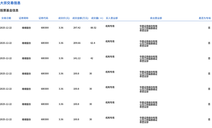 12月22日,维维股份大宗交易成交312.92万股,成交额1051.4万元,占当日总成交额的5.22%,成交价3.36元,较市场收盘价3.7元折价9.19%。