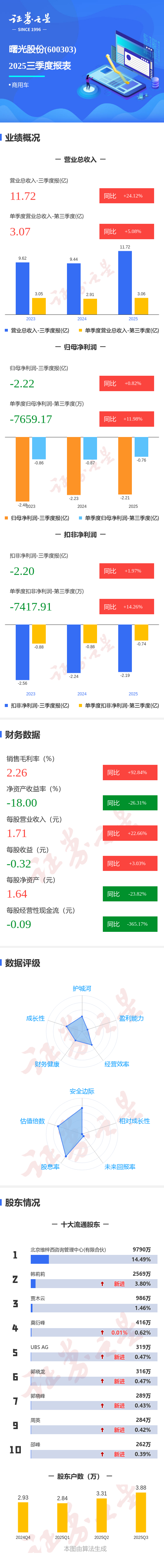证券之星消息,曙光股份2025年三季报显示,前三季度公司主营收入11.72亿元,同比上升24.13%;归母净利润-2.22亿元,同比上升0.82%;扣非净利润-2.2亿元,同比上升1.98%;其中2025年第三季度,公司单季度主营收入3.07亿元,同比上升5.09%;单季度归母净利润-7659.17万元,同比上升11.99%;单季度扣非净利润-7417.91万元,同比上升14.27%;负债率65.17%,投资收益-7.34万元,财务费用2973.53万元,毛利率2.26%。
