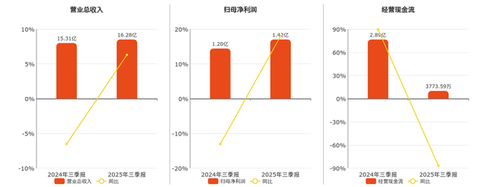 公司营业总收入为16.28亿元,较去年同报告期营业总收入增加9649.54万元,同比较去年同期上涨6.30%。归母净利润为1.42亿元,较去年同报告期归母净利润增加2159.50万元,同比较去年同期上涨17.98%。经营活动现金净流入为3773.59万元。