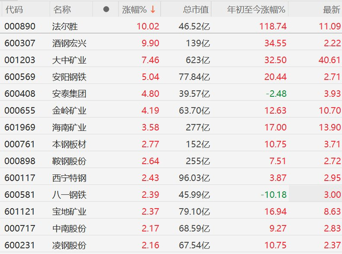 格隆汇3月13日|A股市场钢铁股今日表现活跃,其中,法尔胜、酒钢宏兴涨停,大中矿业涨超7%,安阳钢铁涨5%,金岭矿业涨超4%,海南矿业涨超3%,本钢板材、鞍钢股份、西宁特钢、八一钢铁、宝地矿业、中南股份、凌钢股份涨超2%。分析人士指出,钢铁股的活跃,主因政策层面的“反内卷”与供给侧重塑、成本端推升、以及市场对行业底部复苏的强烈预期共同驱动。