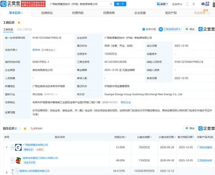 企查查APP显示,近日,广西能源集团桂中(忻城)新能源有限公司成立,法定代表人为熊伟伟,注册资本为1.5亿元,经营范围包含:发电业务、输电业务、供(配)电业务。企查查股权穿透显示,该公司由广西能源集团有限公司、国家电力投资集团有限公司旗下国家电投集团江西电力有限公司共同持股。