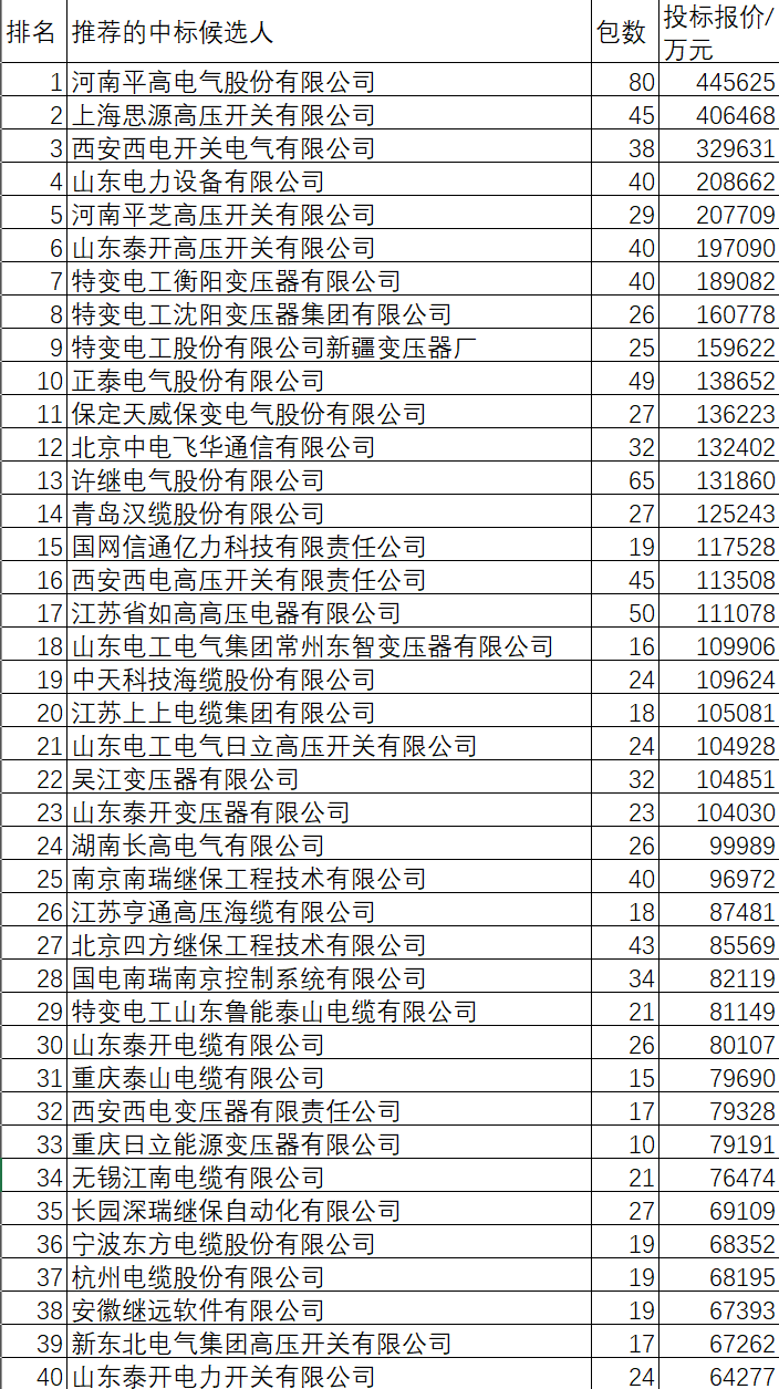 第40的山东泰开电力开关有限公司中24包64277万元。所中2类物资中,断路器2包2812万元,组合电器22包61464万元。