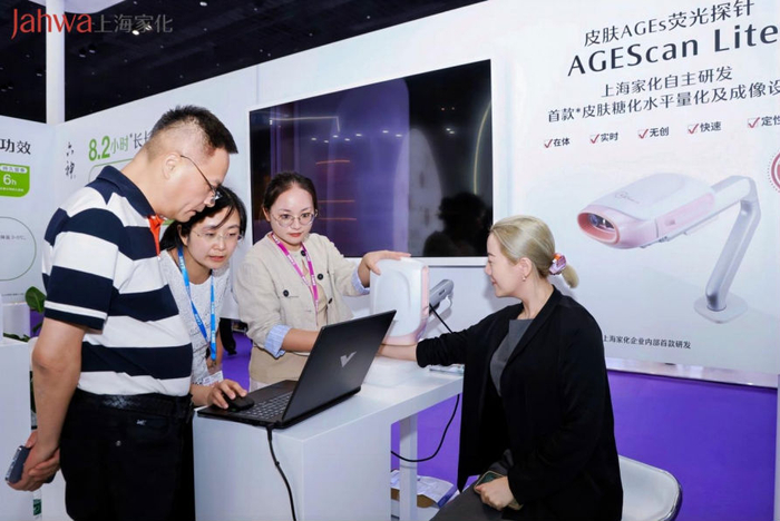 展会期间,上海家化研发中心正式推出首款“皮肤糖化水平量化及成像设备——皮肤AGEs荧光探针AGEScan Lite”。该设备实现了在体、实时、无创的皮肤糖化水平定量分析与成像,突破行业技术难题,填补了化妆品领域在体无创糖化定量检测的空白。