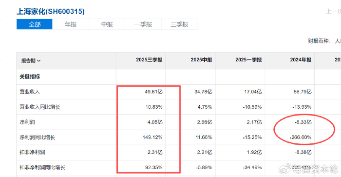 效果还是较为明显。从2025年第二季度开始,上海家化营收和净利润同比都迎来了正增长,到三季度更是有点“井喷”式增长。
