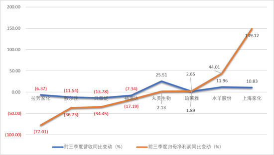 “一哥”珀莱雅罕见地出现单季度营收、净利润双双两位数下滑。拉芳家化、敷尔佳、贝泰妮、福瑞达三季报营收、净利润双双走跌。上海家化、水羊股份实现业绩增长,很大一部分原因去年业绩大跌,丸美生物则是靠对外投资稳住业绩。
