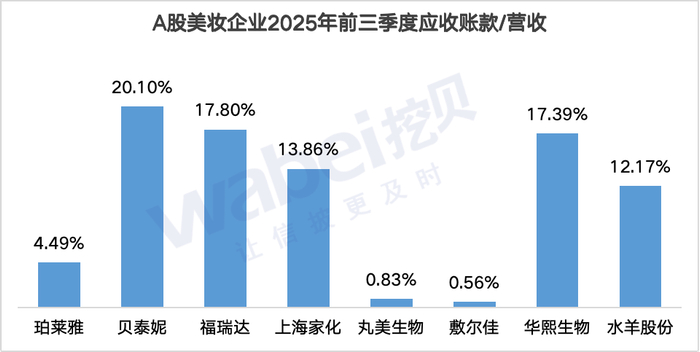 先来看应收账款管理情况,截至2025年9月末,贝泰妮应收账款占营收比重为20.10%,在8家企业中最高;华熙生物、福瑞达该项指标在17%-18%左右。另外,收入规模最高的珀莱雅,应收账款占营收比重仅4.49%。